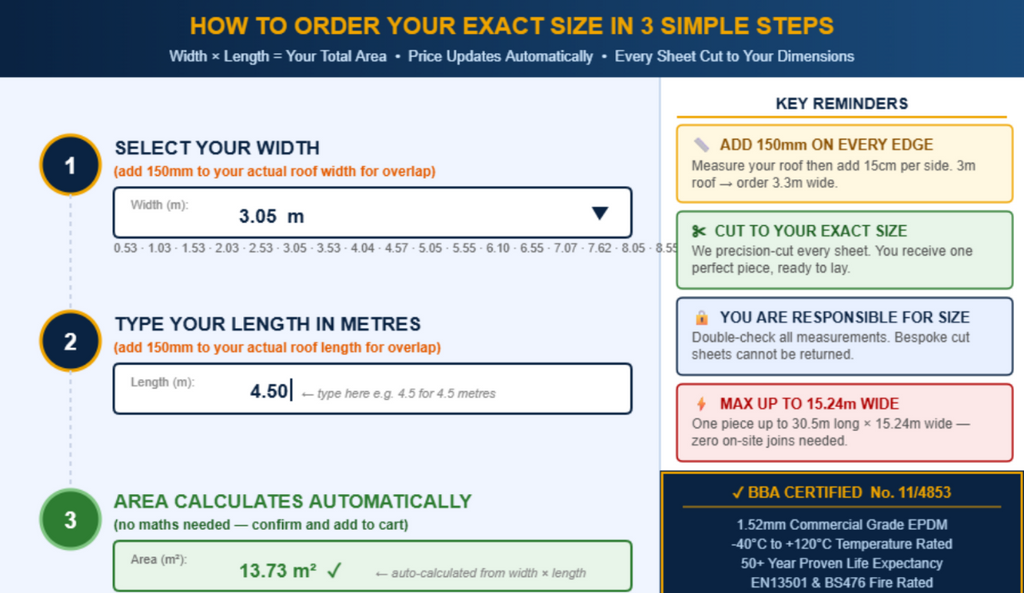 💡 Pro Tip: Not sure which width to select? Choose the next size up. The 1.5mm membrane is more pliable than standard, making it easier to fold and trim at edges and upstands.